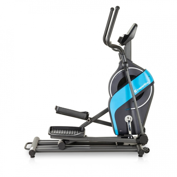En elliptisk træningsmaskine fra inSPORTline med svinghjulet på forsiden, hvilket bidrager til et meget kompakt design, der tager lidt plads.