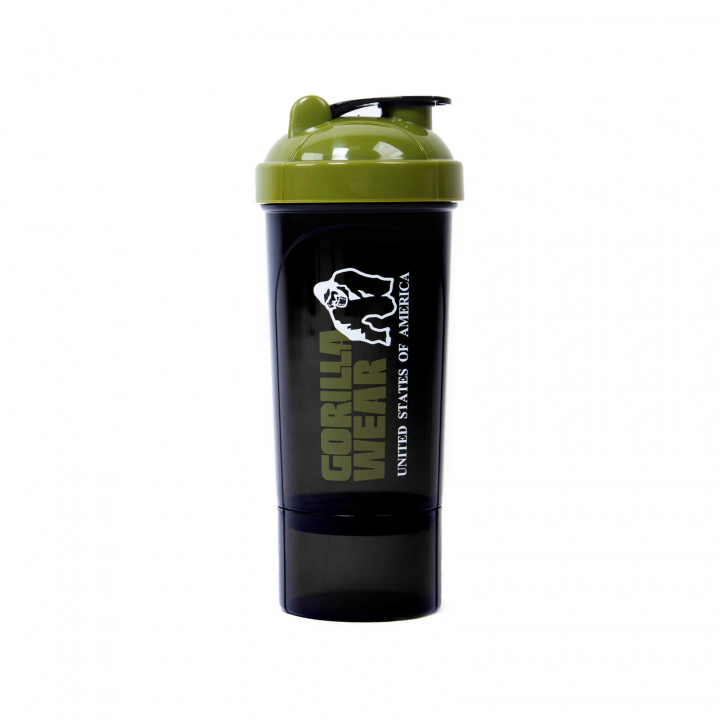 Kompakt shaker i sort/grøn farve fra Gorilla Wear med separat opbevaringsbeholder!