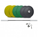 En overkommelig bumperset med en professionel Olympic vægtstang og 3 par vægtskiver (5 kg, 10 kg, 15 kg) og 2 fjeder lås til krævende brug og lignende i crossfit uddannelse.